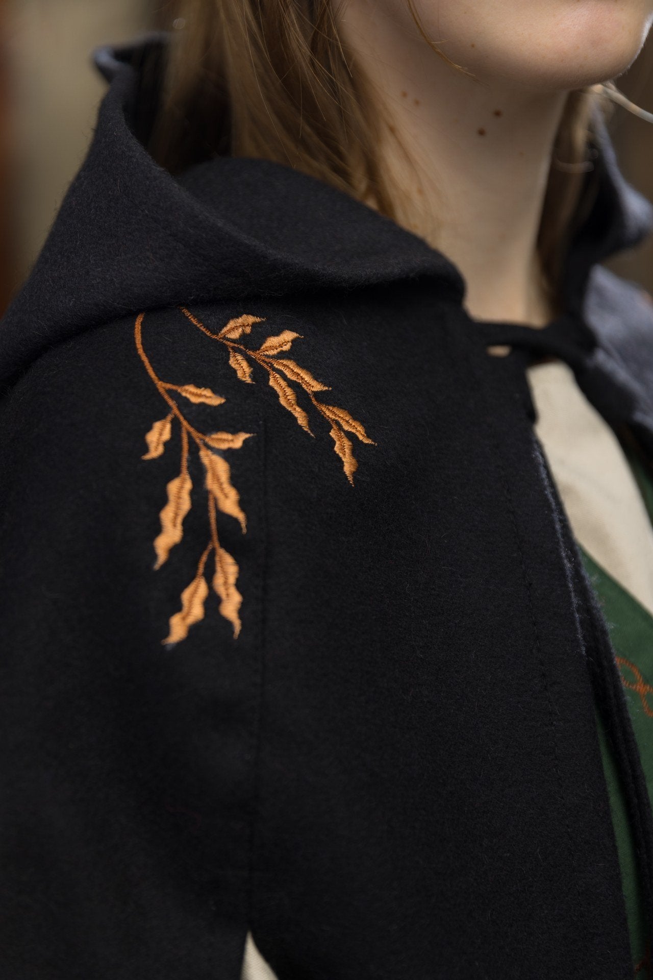 Außergewöhnlich schönes mittelalterliches Cape aus wärmenden Wollfilz. Das halblange Cape mit im Armbereich seitlich eingearbeiteten Schlitzen, die lange spitze Kapuze und besonders die florale wunderschöne Stickerei im Schulterbereich geben dem Cape und der Trägerin eine