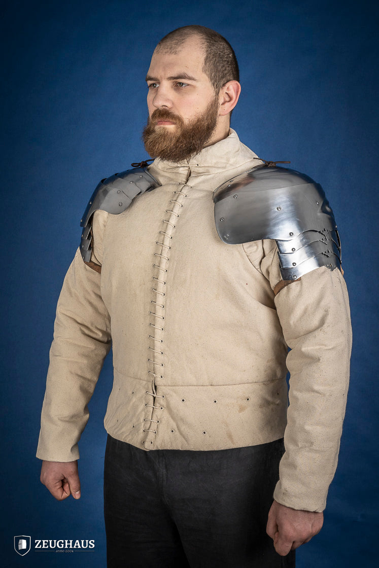 Die seitliche Befestigung sorgt für einen sicheren Sitz, während die Riemen des Kragens leicht an anderen Rüstungsteilen befestigt werden können. Der Hals wird durch eine steife Konstruktion geschützt, die dennoch die Freiheit der Beweglichkeit zulässt. Das Ergebnis? Eine wunderbare Kombination aus Stärke und Flexibilität für das Schlachtfeld.