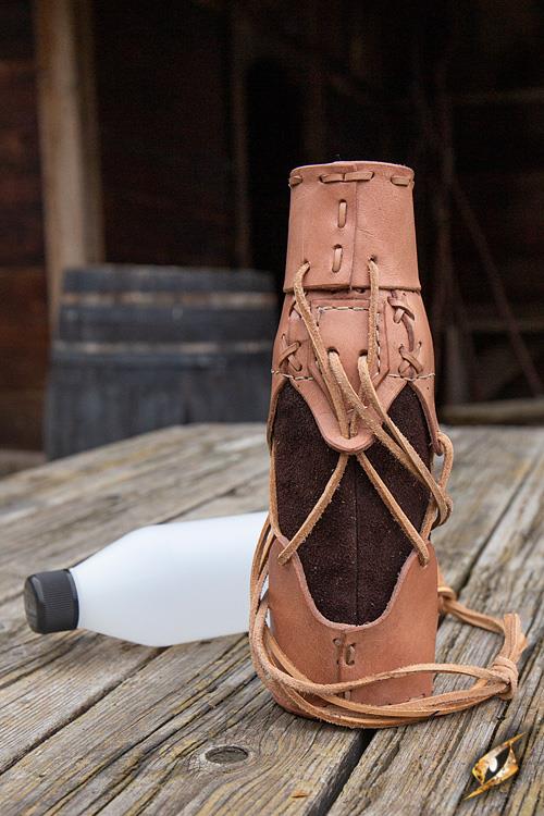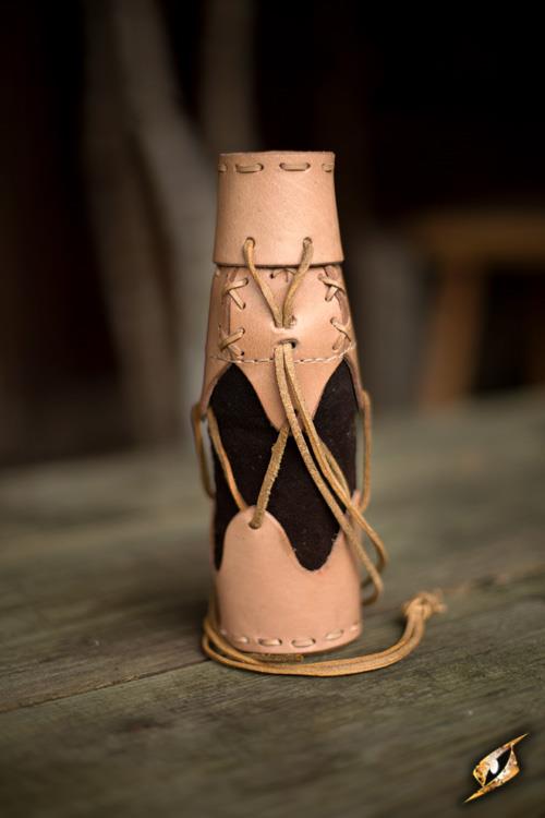 Schieben Sie die Flasche durch die Wildlederhülle, bevor Sie die Kappen aus genarbtem Leder zusammenschnüren. Verschließen Sie die Flasche mit einer letzten Lederkappe, die mit einer langen und haltbaren Lederkordel am Halter befestigt ist, die Sie zum einfachen Transport an Ihrem Gürtel befestigen können.