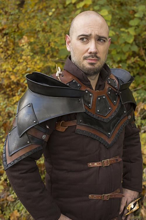 Die Rogue Neck and Shoulders von Epic Armoury ist ein gegliederter Rüstungssatz zum Schutz von Hals, Schultern, Oberarmen und Brust. Die Rüstung besteht aus sechs Teilen: einem zweiteiligen Brustpanzer, zwei Schulterpanzern und zwei Oberarmschützern. Der Brustharnisch bedeckt den Brustkorb bis zum Brustbein und ist sowohl mit Metall als auch mit Leder ausgestattet. Der Brustpanzer und die Schultern sind mit Riemen aus hochwertigem Leder und einer starken Kordel befestigt. Zusätzlich wird ein starker Lederriemen um die Brust gelegt.