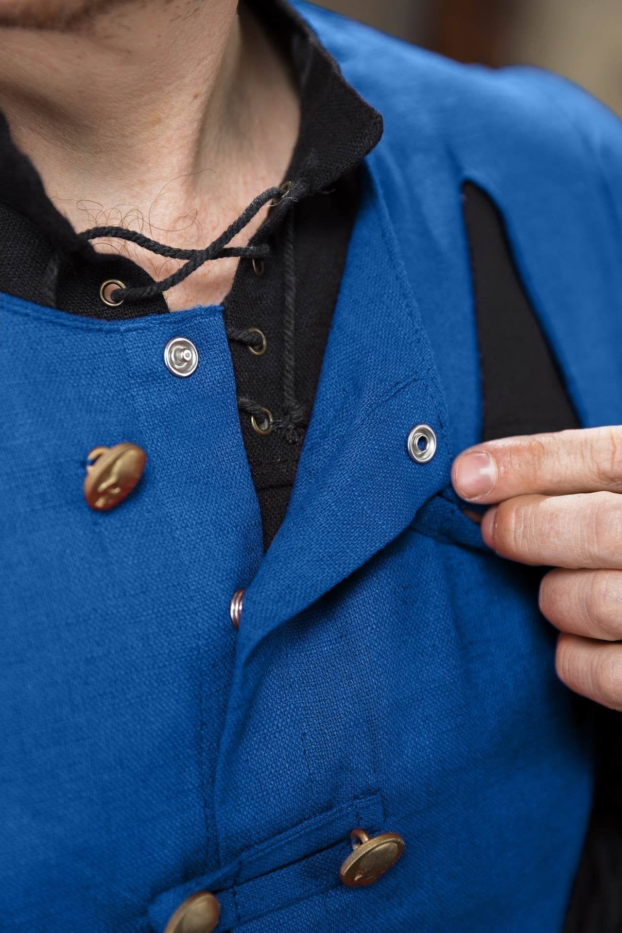 Markante Diamantschlitze schaffen einen kühnen Kontrast, wenn sie über einem kontrastierenden Kragen getragen werden, und sorgen für eine imposante Präsenz, ob auf dem Schlachtfeld oder am Hof. Für eine sichere und gepflegte Passform sorgen drei messingene Knöpfe mit Schädelsymbolen, die die Vorderseite schließen, verstärkt durch versteckte Druckknöpfe für zusätzliche Stabilität. Die Schlaufen, aus demselben Stoff des Wams gefertigt, gewährleisten Langlebigkeit und bewahren ein kohärentes und authentisches Erscheinungsbild.