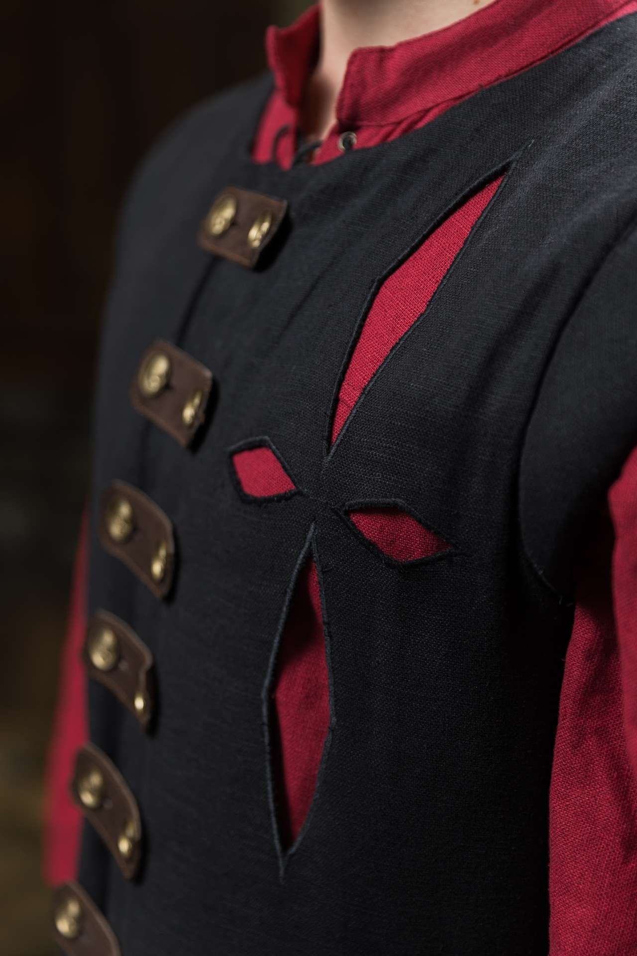 Dieses Wams ist mit durchdachter Schnittführung gefertigt und verfügt über rautenförmige Schlitze auf der Brust, die eine kontrastierende Schicht darunter für einen auffälligen visuellen Effekt sichtbar machen. Der Frontverschluss wird durch fünf verstärkte Lederriemen mit Metallverschlüssen gesichert, die einen sicheren und verstellbaren Sitz gewährleisten und gleichzeitig ein Element martialischer Eleganz hinzufügen. Der gespaltene untere Saum sorgt für mehr Flexibilität und Bewegungsfreiheit und macht dieses Wams sowohl praktisch als auch optisch ansprechend.