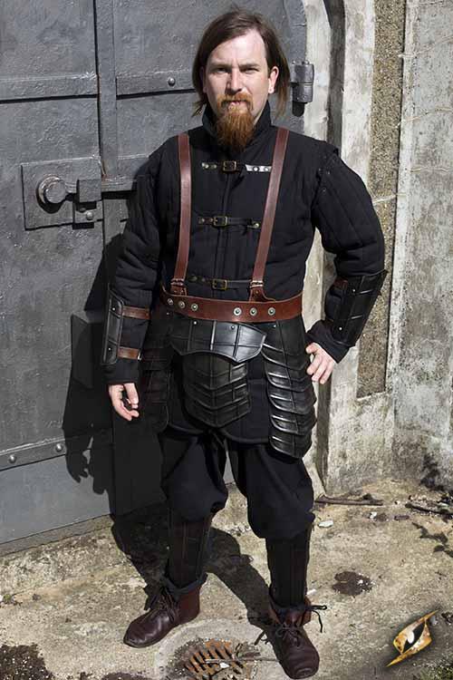Fesseln zum Schutz des Oberschenkels und der Leistengegend. Es handelt sich um einen spätmittelalterlichen Stil mit gerollten, kantigen Metallplatten, die sich überlappen. Zwei Sätze von Stahlplatten hängen von den Hüften herab und bedecken die äußeren Oberschenkel. Ein dritter Satz schlankerer Platten bedeckt die Leistengegend und bietet einen gewissen Schutz für die Innenseite der Oberschenkel. Das Set wird mit einem Ledergürtel mit Hosenträgern geliefert, um das Teil an seinem Platz zu halten.