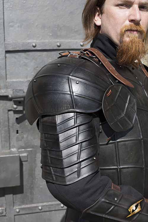 Ein Satz aus zwei Schulterpanzern mit Schulterklappen, Schulterklappen und Besen. Die Schulterpanzer bestehen aus vier schuppenartigen, geriffelten Metallplatten, die übereinander liegen und die Oberarme mit einem Laminat schützen. Darüber liegt ein großer Panzer, der zusätzlichen Schutz für das Schultergelenk und die Achselhöhlen bietet. Besauger (kleine runde, gewölbte Metallschilde), die mit Lederschnüren an den Spuldern befestigt sind, bieten zusätzlichen Schutz für die Achselhöhlen. Die Schulterplatten sind mit Lederriemen um den Bizeps und am Schulterblatt befestigt, die mit einer Brust- und Rückenplatte verbunden sind.
