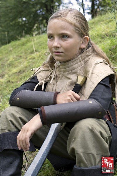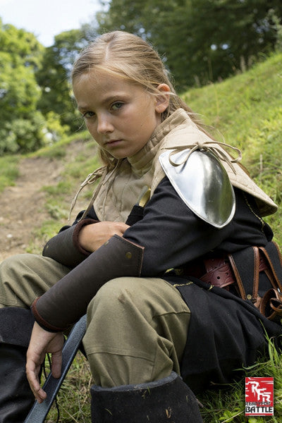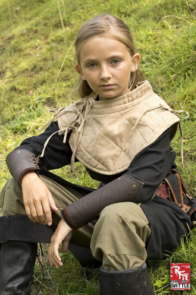Dieser Gambeson-Kragen mit Panzerschultern ist besonders bequem und passt zu vielen Charakteren auf einem LARP oder Mittelaltermarkt. Die Panzerschultern werden mit Schnüren am Kragen befestigt und können daher beliebig versetzt werden.