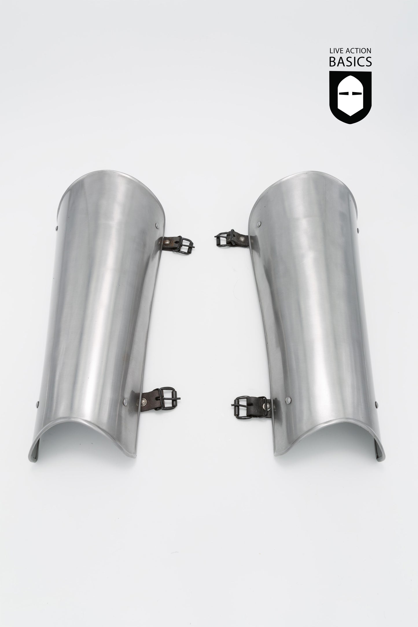 A staple for protective armor, these greaves provide full coverage of the knees. They’re secured in place by a belt-like fastening which can be adjusted for different sizes and is held together through metal clasps.