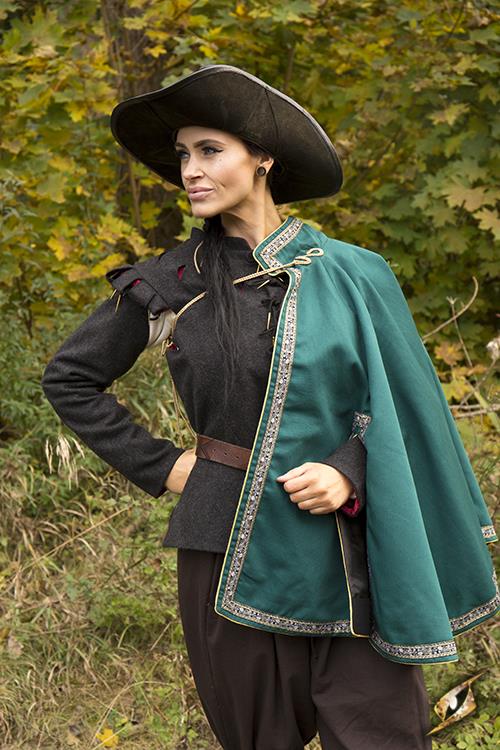 Epic Armoury’s Azure Green Cape Aramis is a hip-length caplet with a high collar and decorative cord fastening. The design is meant to offer a top layer of glamour that can be worn over one or both shoulders. Made from green cotton and cut to include extra billowing fabric, this cape is embellished with a detailed gold and black trim. Its fine appearance makes for a great accessory for a variety of Renaissance or fantasy costumes, especially nobility or musketeers.