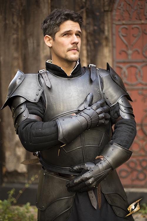 Slide your arm through the leather brace and fingers into the attached black suede glove, securing tightly with the additional leather strap over the forearm to keep these gauntlets in place. Made of 1 mm thick galvanized mild steel and top-grain leather straps and fittings, these armour pieces are built to withstand the abuse of a LARP or reenactment with regular leather and metal armour care.