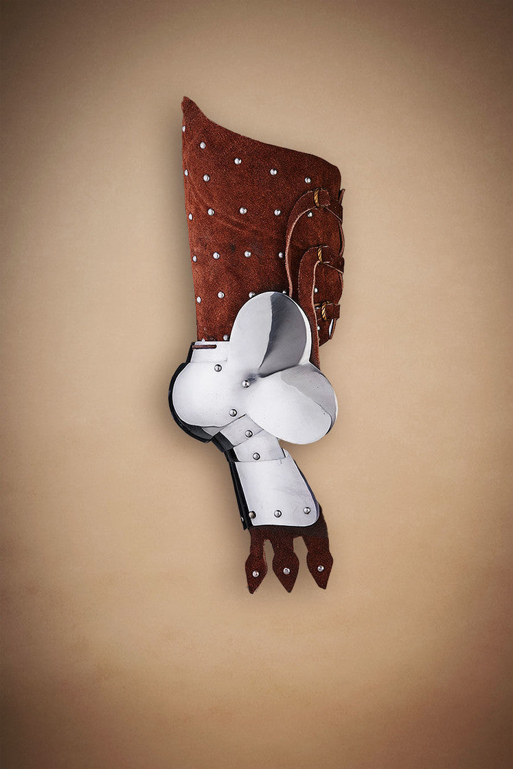 This Leather Leg Armor draws its inspiration from historical designs, featuring steelwork meticulously merged with supple leather to create a formidable protective piece. Each leg piece showcases studded leather, lending an unmistakable rugged appeal. The armor features straps and buckles discreetly positioned at the back for a secure fit. Knee guards are fortified with a gleaming touch of steel to safeguard this pivotal joint.