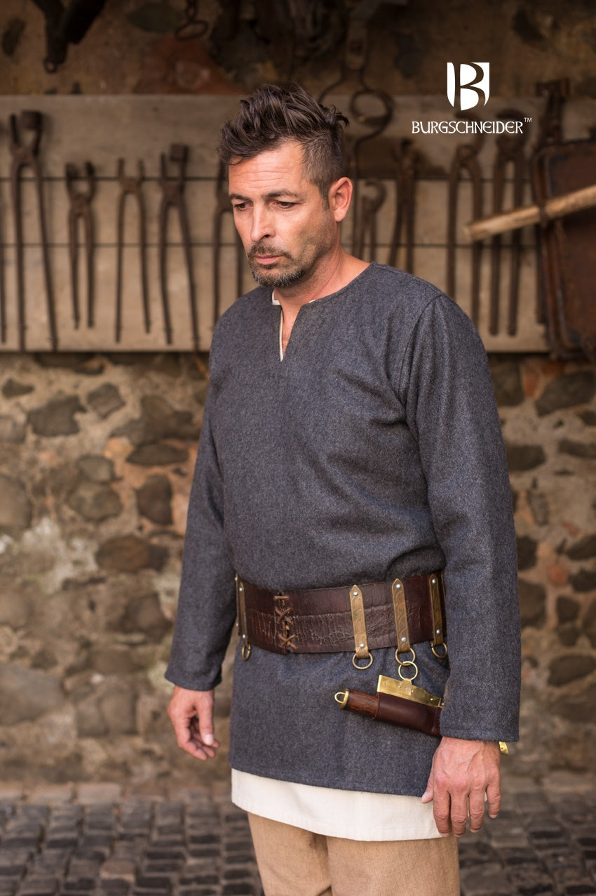 Our wool tunic can of course be worn with or without an under tunic. We recommend our Wool Thorsberg Pants Fenris and our Wool Winingas Aki with it to further emphasize the imposing impression of the short tunic.