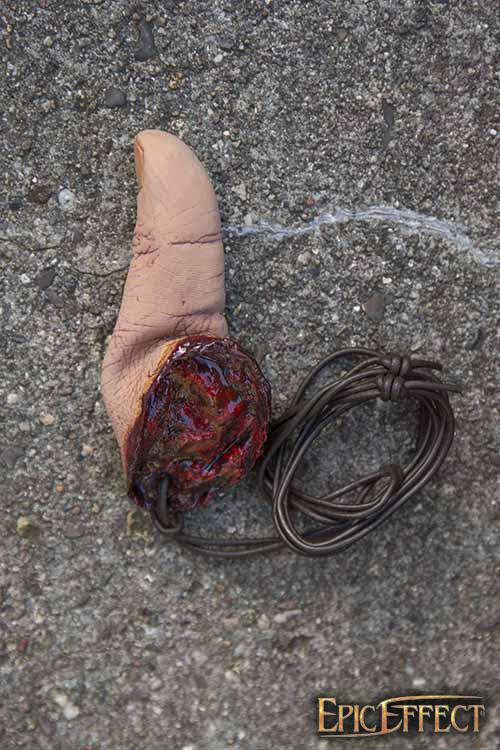 Epic Armoury’s Human Thumb Trophy is a grisly latex accessory designed to imitate the thumb of a humanoid foe. Made from 100% natural latex and stuffed with cotton to give it a realistic weight and feel, this finger adornment can be hung as a talisman from a belt or neck using its leather cord. It is sure to create fear--and hatred--in the hearts of your enemies.