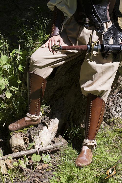 Epic Armoury’s Squire Greaves are a pair of sturdy leg guards designed to protect the shins during combat. Made from four thick full-grain leather plates fit together using tough leather cords, these greaves have great structural strength to make them last a long time and resist deformation. Comfort is also important, as these greaves feature soft split-leather lining against your skin on the inside.