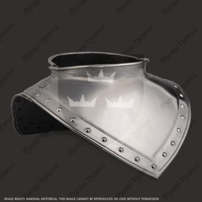 Ringkragen sind eine wirksame Methode, um den Hals und dessen Umgebung zu schützen. Dieses Stück ist von Modellen aus dem 16. bis 17. Jahrhundert inspiriert und bietet einen gewissen Schutz für den Hals. Es wird mit einem Riemen und einem Schnallenverschluss zusammengehalten. Die Nieten am äußeren Rand sorgen für ein dezentes, aber stilvolles Aussehen. Dieser besondere Ringkragen ist perfekt für Charakterkonzepte, die auf dem 16. Jahrhundert basieren.