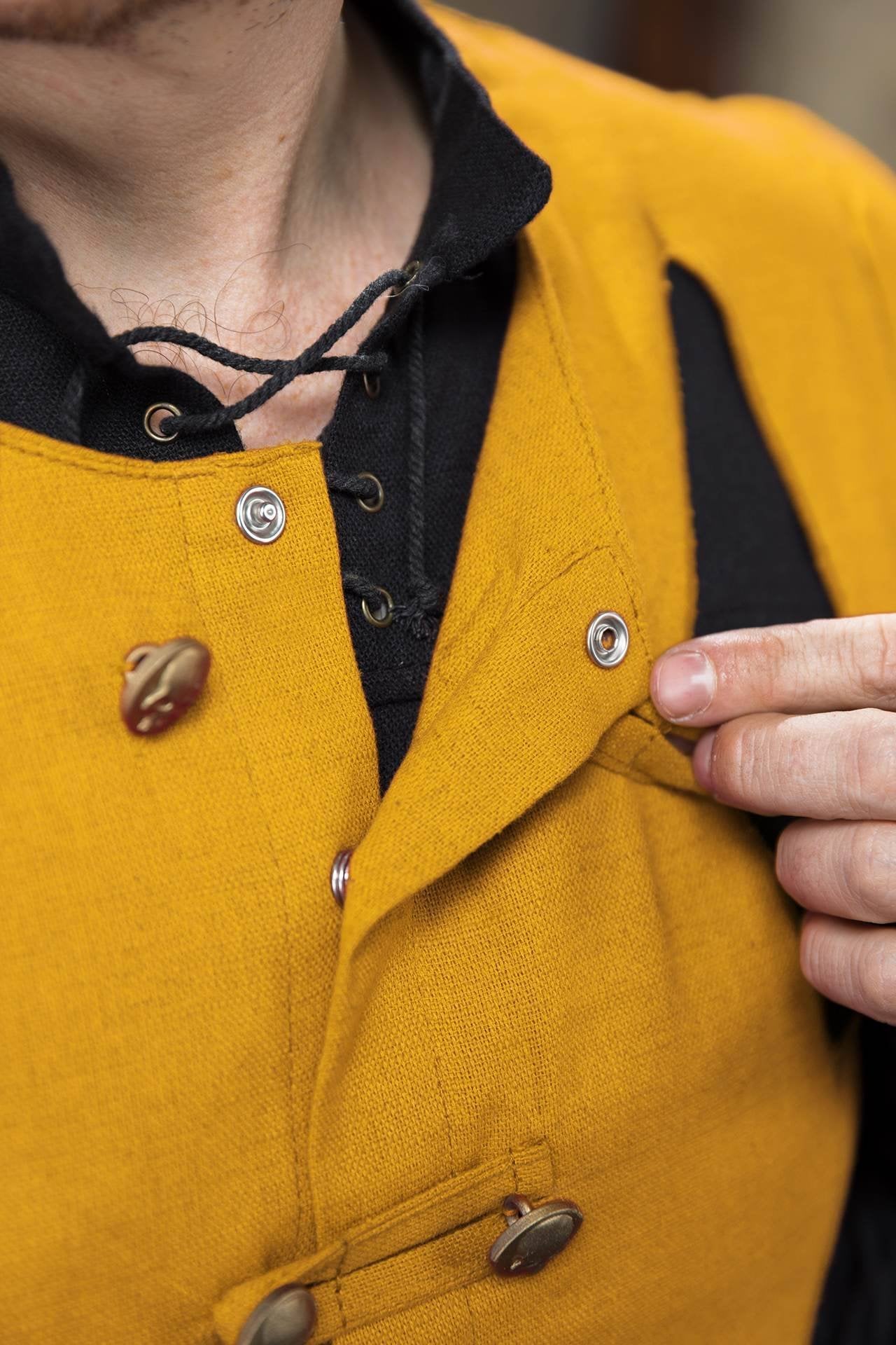 Markante Diamantschlitze schaffen einen kühnen Kontrast, wenn sie über einem kontrastierenden Kragen getragen werden, und sorgen für eine imposante Präsenz, ob auf dem Schlachtfeld oder am Hof. Für eine sichere und elegante Passform sind drei messingbeschichtete Knöpfe mit Totenkopfmotiven an der Vorderseite angebracht, verstärkt durch versteckte Druckknöpfe für zusätzliche Stabilität. Die Schlaufen, gefertigt aus dem gleichen Stoff wie der Körper, gewährleisten Langlebigkeit und bewahren ein zusammenhängendes und authentisches Erscheinungsbild.
