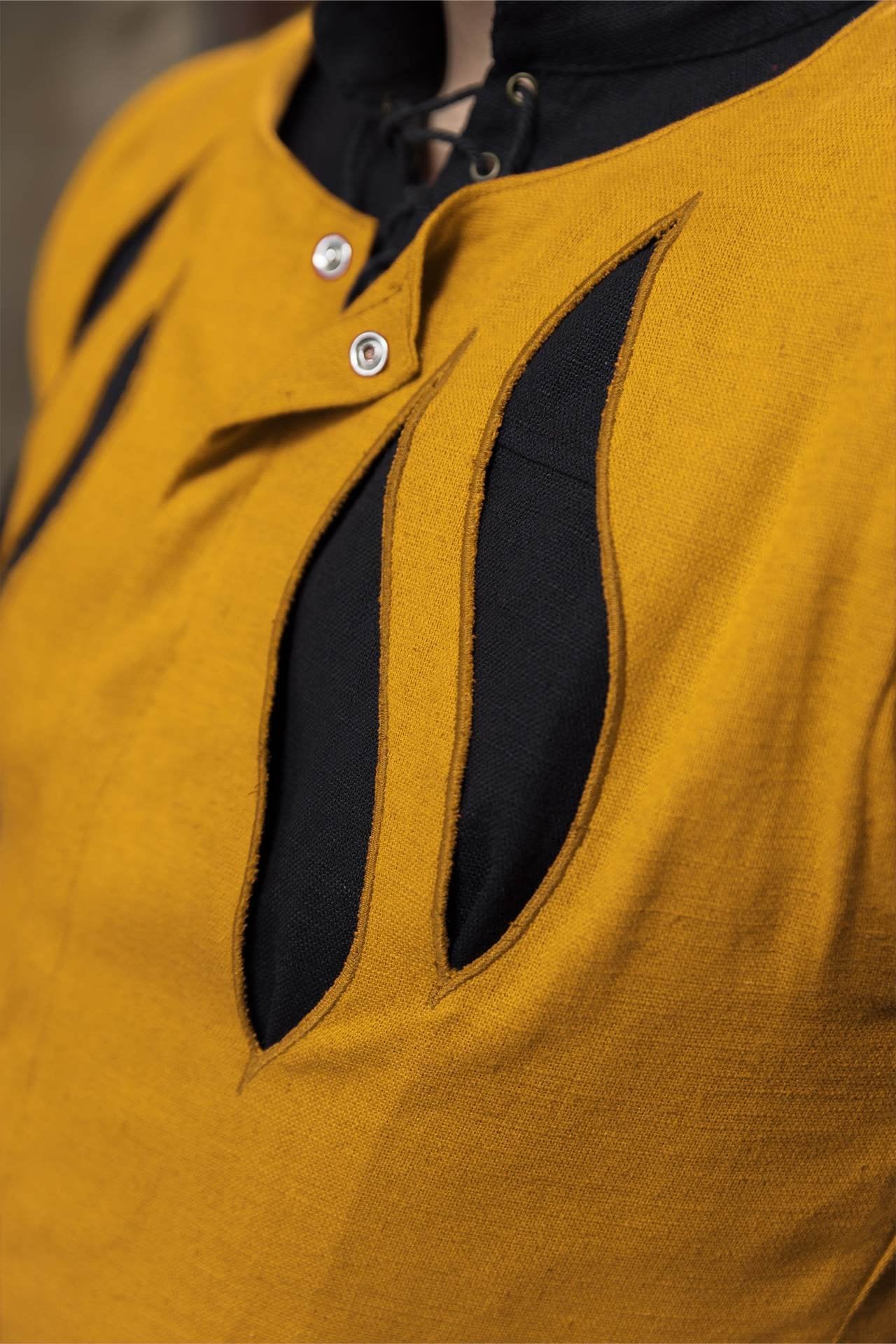 Hergestellt aus robusten Materialien mit verstärkten Nähten, bietet dieser Jerkin sowohl Flexibilität als auch Widerstandsfähigkeit, was ihn ideal für den Kampf, zeremonielle Anlässe oder den täglichen Gebrauch macht. Die konturierte Panelung verbessert die Beweglichkeit und bewahrt gleichzeitig eine strukturierte und imposante Silhouette. Intrikate gestickte Details entlang der Brust verleihen eine Note von Raffinesse und spiegeln den Prestige der imperialen Krieger wider.